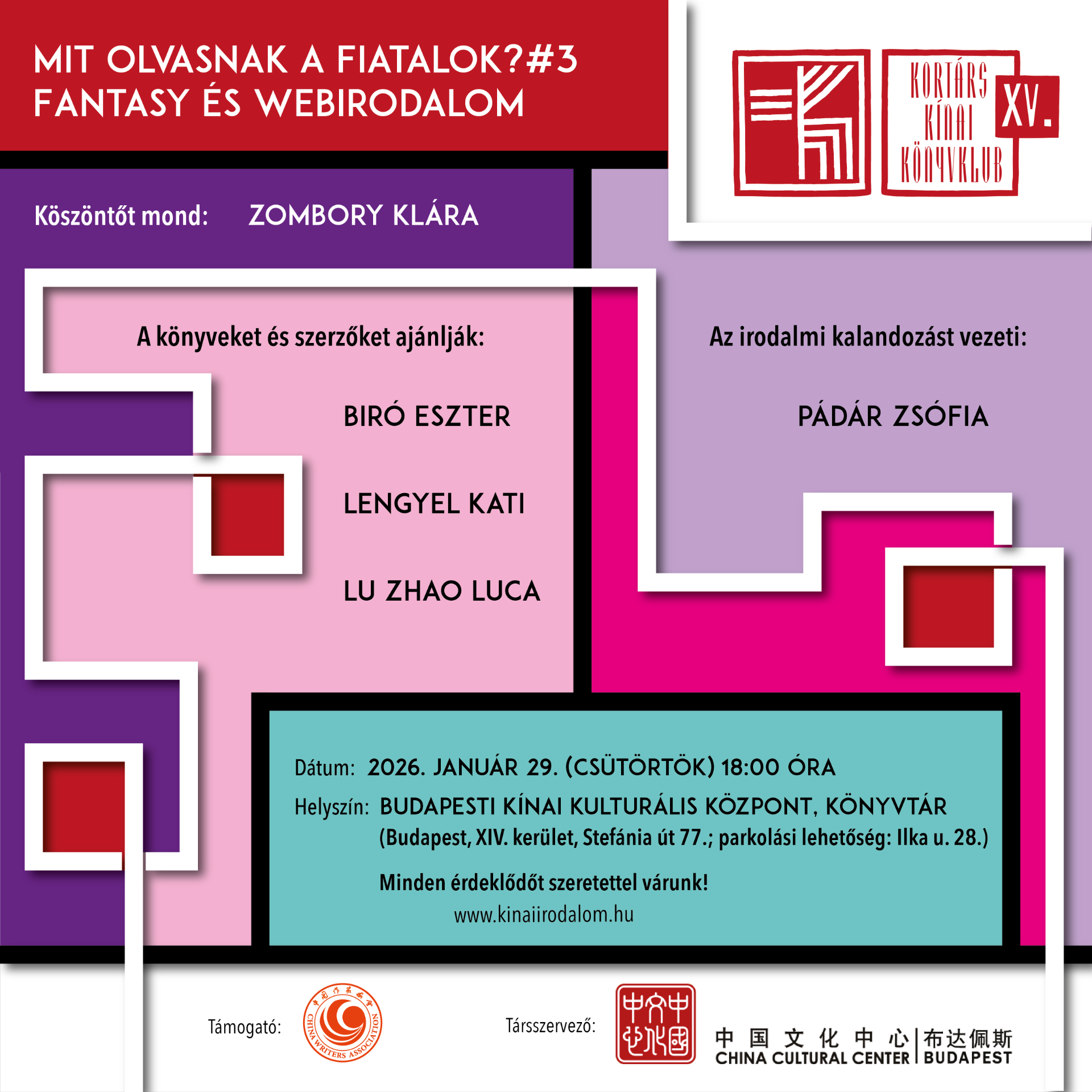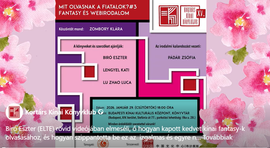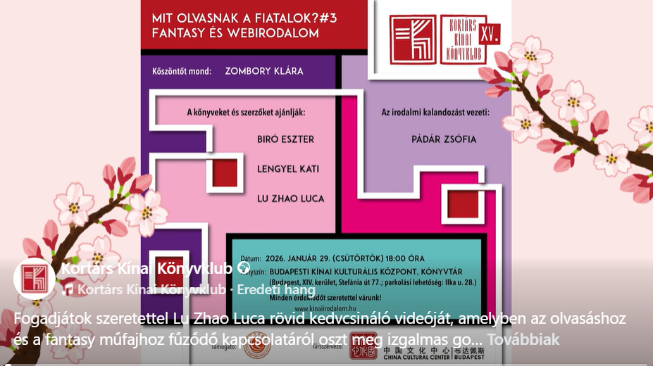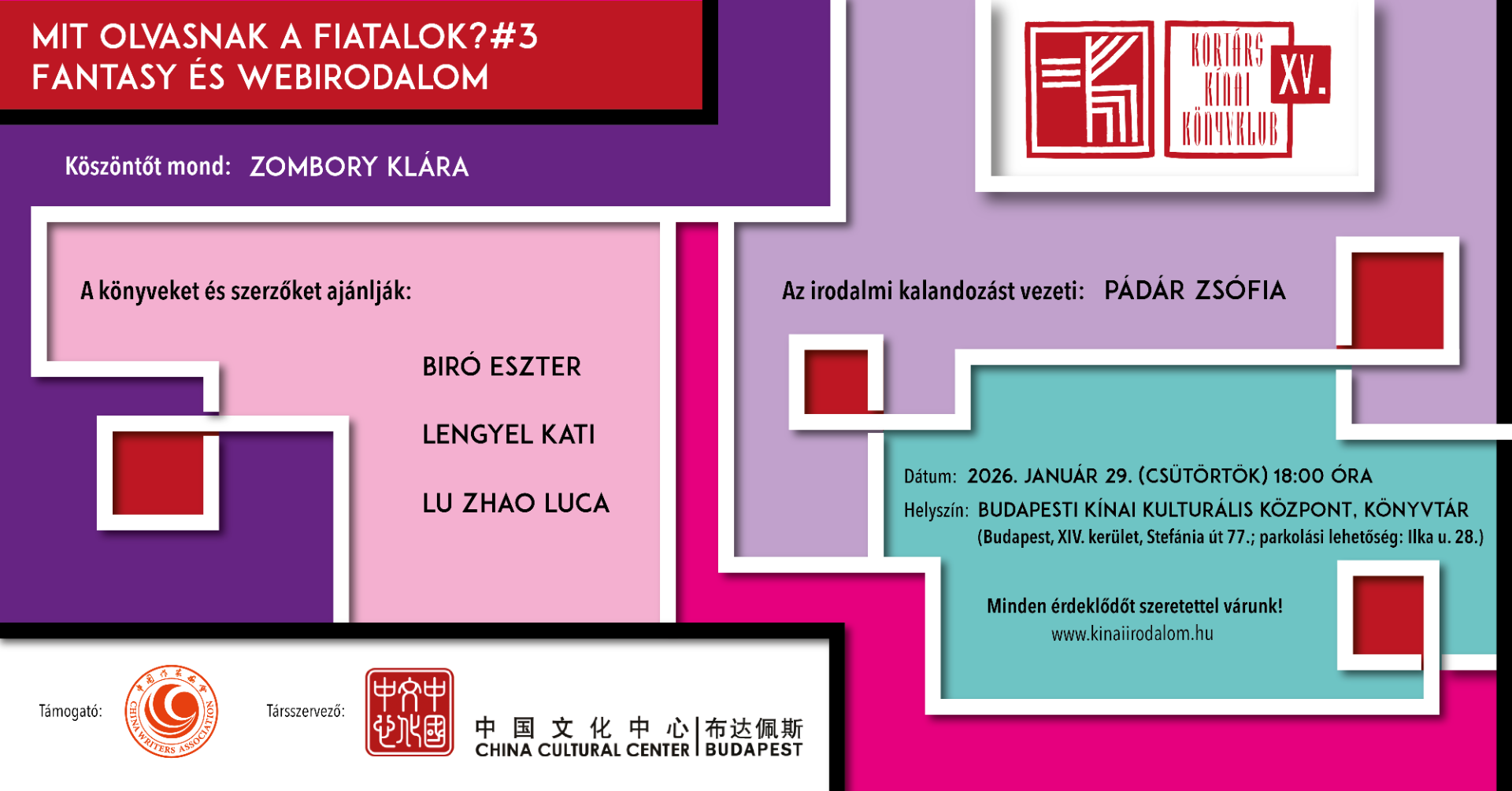 Helyszín: BUDAPEST KÍNAI KULTURÁLIS KÖZPONT, KÖNYVTÁR (Budapest, XIV. kerület, Stefánia út 77.; parkolási lehetőség: Ilka u. 28.)
